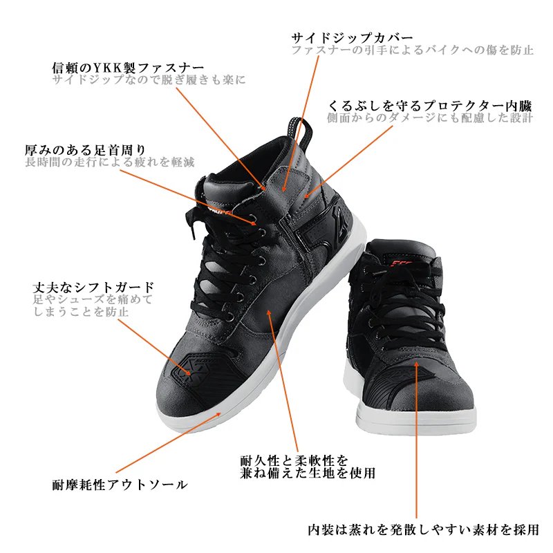 スコイコ SCOYCO 防水カジュアルライディングシューズサイズ:40(25.5cm)カラー:ブラック【仕様説明】・カジュアルな雰囲気で、スニーカーのようなバイク用ライディングシューズ。・耐久性と柔軟性を兼ね備えた生地なので、履き始めから足に馴染みます。・歪みの少ないソールは足首をひねりを防止。・靴底のシャンク(踏まず芯)が正確なステップワークをサポート。【機能】・つま先、かかと、くるぶし部分にプロテクター装備・シフトパッド装備・靴底(アウトソールとインソールの間)にスチール製のシャンクを配置