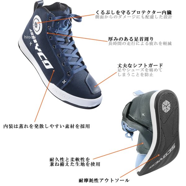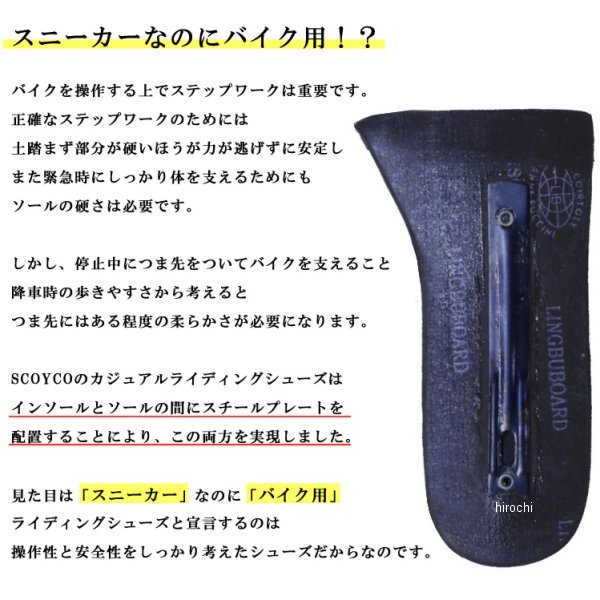 スコイコ SCOYCO カジュアルライディングシューズサイズ:42(27.0cm)カラー:ブラック【仕様説明】・カジュアルな雰囲気で、スニーカーのようなバイク用ライディングシューズ。・耐久性と柔軟性を兼ね備えた生地なので、履き始めから足に馴染みます。・歪みの少ないソールは足首をひねりを防止。・靴底のシャンク(踏まず芯)が正確なステップワークをサポート。【機能】・つま先、かかと、くるぶし部分にプロテクター装備・シフトパッド装備・靴底(アウトソールとインソールの間)にスチール製のシャンクを配置