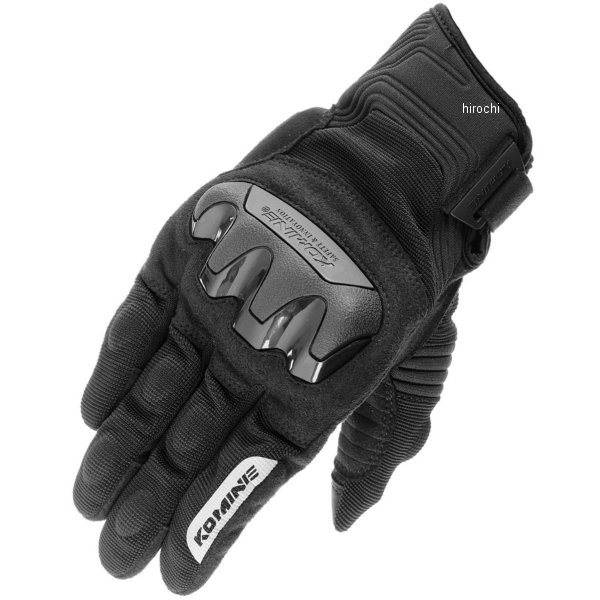 コミネ KOMINE 春夏モデル プロテクトメッシュグローブサイズ:Lカラー:ブラック素材:合成皮革、ナイロン、ネオプレン、ポリエステル、山羊革プロテクター:ナックル、手のひらラバーナックルガードを採用したメッシュグローブ。ハードな見た目と裏腹に包み込まれるような優れたフィット感が魅力。・拳にカーボンプロテクターを装備したメッシュグローブ・握りやすい立体パターン採用・カーボンスライダー(掌)・衝撃吸収フォームパッド(手首)・伸縮シャーリングパネル(指)・グローブと手の一体感を高めるベルト付きベルクロカフ(手首)・スマートフォン操作可能・偽造防止4Dラベル