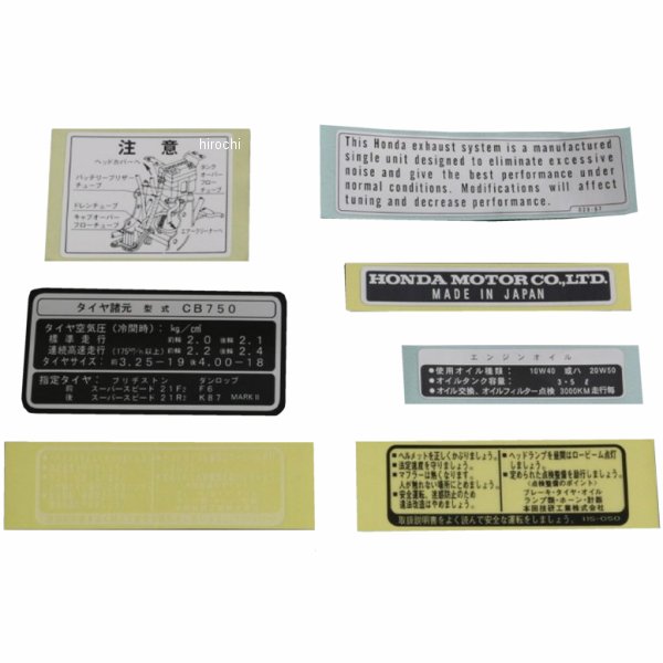 ピーエムシー PMC コーションラベルセット 日本語ホンダ CB750Kタイヤコーション、エンジンオイルコーション、ガソリンタンクコーション黒字、ガソリンタンクコーション白字、フレームコーション、スイングアームコーション、バッテリーコーション、の7枚をセットにしたオールインワンパッケージで日本語版と英語版の2ラインナップ。
