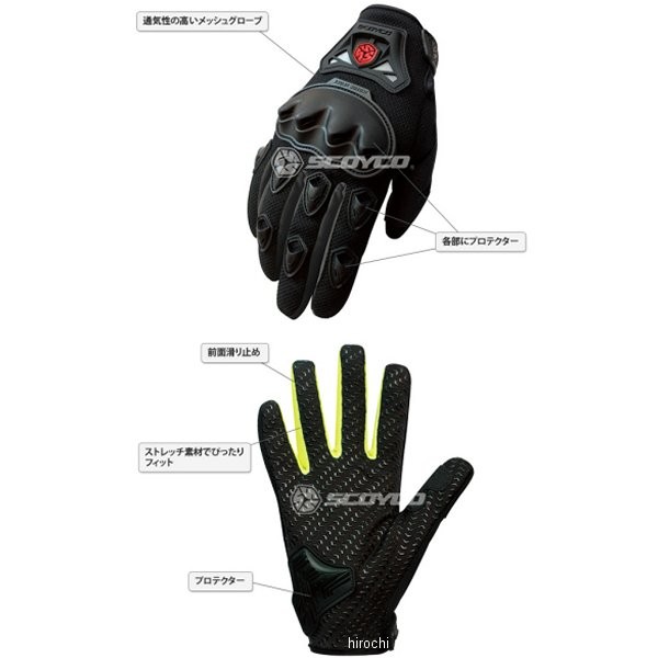 スコイコ SCOYCO シンプルライディングメッシュグローブサイズ:XLカラー:ブラック【素材】ポリエステル 85%、ポリプロピレン 10%、その他5%【特徴】手のひら側には滑り止め加工をしています。拳と手のひらを守るプロテクター採用しています。前面メッシュ生地なので夏でも快適です。