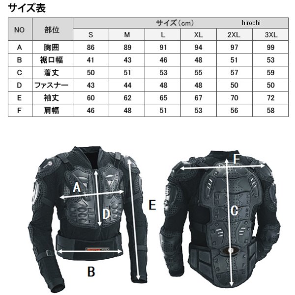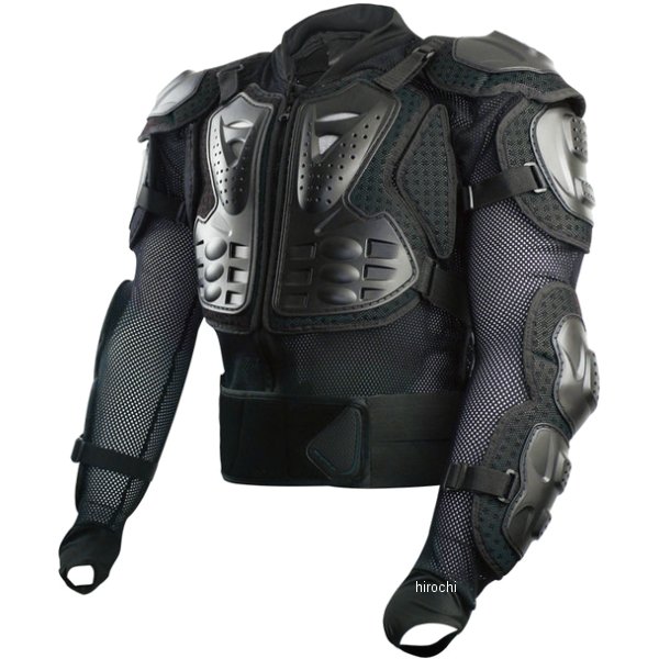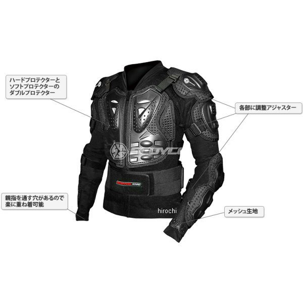スコイコ SCOYCO TITAN ボディーアーマージャケットサイズ:3XLカラー:ブラック【素材】ポリプロピレン40%、ポリエステル25%、ポリエチレン20%、ポリウレタン6%、その他9%【特徴】外側には固い素材を、内側には柔らかい素材を採用することで高いプロテクション性を実現しました。動きの妨げにならないよう、各部とも関節を意識したプロテクターの配置です。腰のベルトは体幹をサポートすることにより長時間のライディングによる疲労を軽減します。肌に触れるのはメッシュ生地のため蒸れにくいです。