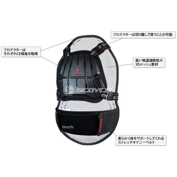 スコイコ SCOYCO ACHILLES ボディーアーマーサイズ:フリーカラー:ブラック【素材】ポリウレタン80%、ポリエステル15%、PVC2%、PP3%【特徴】街乗りからサーキットまで使える胸部&脊椎パッドセット。それぞれ切り離して使えます。新設計の形状記憶フォームにより高い衝撃吸収性を実現。CEマーク取得しています。バックプロテクターと胸部プロテクターは切り離して使用することが可能です。腰のベルトは体幹をサポートする事により長時間のライディングによる疲労を軽減します。各ベルトはサイズの調整が可能です。