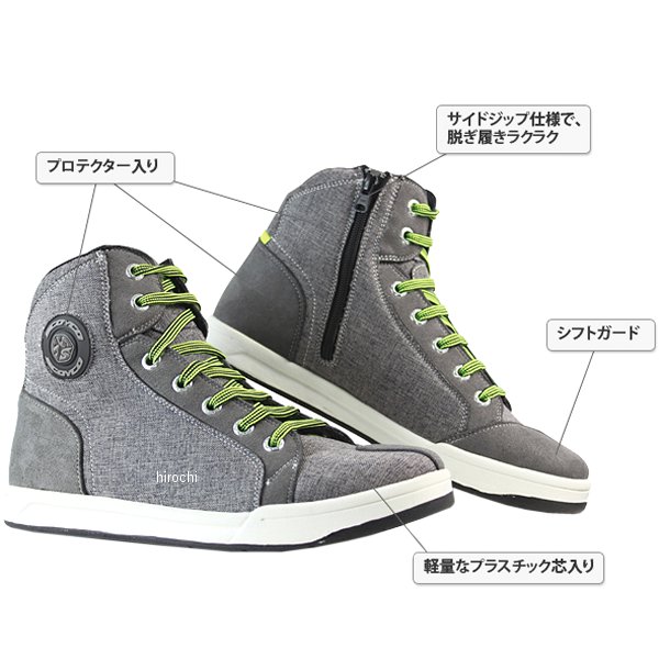 スコイコ SCOYCO カジュアルライディングシューズサイズ:37(23.5cm)カラー:グレー【素材】表地:麻、マイクロファイバーレザー裏地:メッシュ靴底:ゴム【特徴】しっかりとしたプロテクションで安全です。カジュアルな見た目でバイクを降りてからも安心です。バイク用ライディングシューズながらカジュアルな雰囲気のスニーカータイプです。ハイカットデザインとサイドジップの組合わせで、脱ぎやすく、また不意に脱げにくいです。くるぶし部にはプロテクターを装備しています。シフトペダルから足や靴を守るシフトパッド付きです。