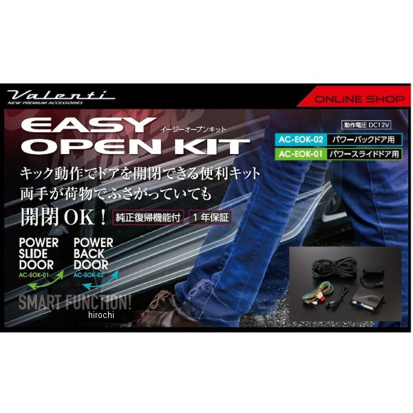 ヴァレンティ VALENTI イージーオープンキットパワースライドドア用両手がふさがっていても車体の下に足を入れることでドアの開閉が可能です。ロック状態でも、スマートキーを携帯した状態で車体下に足を入れるだけでアンロック後にドアが開きます。(※車種や車両スペックによっては、ロック中は動作しません。)センサーは防水仕様で、車体下に設置するためスマートな取り付けが可能。キック動作ですばやく反応します。付属のON/OFFスイッチで、かんたんに機能をOFFにできます。車種別の専用取り付け情報を用意しているため、安心して取り付け作業が可能です。