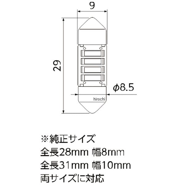 ヴァレンティ VALENTI LEDバルブカラー:アイスホワイト10000車検対応国産車専用ハイブリッド車対応アイドリングストップ車対応LED:高輝度4LED(SMD)ルーメン値:110lm用途:ルームランプ規格:T8×28/T10×31共用(枕球)フェストンタイプ仕様:DC12V入数:1個