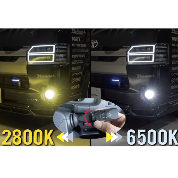 ヴァレンティ VALENTI LED バイカラーフォグバルブH24.5-R4.4 トヨタ ハイエース/レジアスエース 3型後期-6型(KDH2##/TRH2##/GDH2##)フォグランプ専用(PSX26)車検対応ホワイト:6500K(6000lm)イエロー:2800K(6000lm)純正フォグランプスイッチ操作で2色(2800K/6500K)切り替え可能なハイルーメンフォグバルブです。車両側純正フォグスイッチのON/OFF操作で切り替え。消灯状態から3回のON操作で色が切り替わります。通常LEDバルブと同様の取付作業で簡単取付。車両への配線やスイッチを引き込む作業等は一切ありません。高輝度LEDをホワイト、イエローそれぞれに採用。2色タイプフォグでもヘッドバルブ級の明るさを実現しました。2秒以上の点灯で点灯色を記憶。エンジン停止後、再始動時は記憶した色で発光します。万が一左右の色違いが発生した際、左右の色を揃えるためのリセット機能付き。オートライト機能使用時でも色が変わることはありません。※本製品は国産DC12V車両専用です。※取り付けの際、車両によりバンパーなどの脱着が必要な場合があります。※バッテリーが弱っているなど車両の状態によっては、エンジン始動時にチラつくなどの症状が発生する場合があります。※本製品は保安基準の性能要件を満たすよう設計しておりますが、純正LEDとは異なった光に見えることや、車両フォグランプのレンズ状態やバッテリーの電圧低下などが要因で、車検に通らない場合があります。※走行中には色の変更操作をしないでください。※オートライト機能使用時、短いトンネルを連続して走行した場合など、一定の条件を満たした場合、色が切り替わることがあります。※表示のルーメン値は左右両側(車両1台分)合計の数値です。