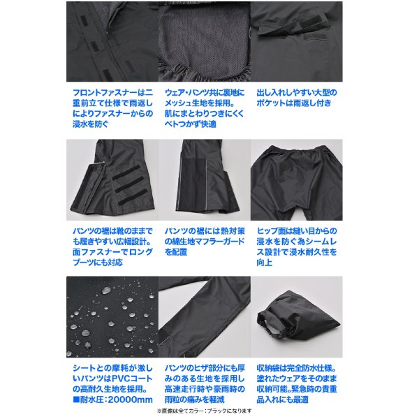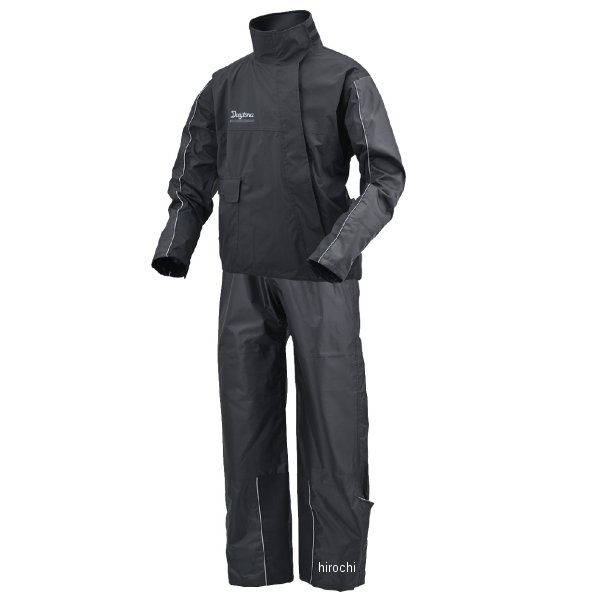 デイトナ DR001 ハイパフォーマンスレインウエア 上下セットサイズ:L (身長170~180 / バスト92~100 / ウエスト79~94 / 股下85(cm))カラー:ブラック素材(ジャケット):ポリエステル100%、TPUコート(裏地)/ 初期耐水圧 - 20000mm JIS L1092 B法 / 初期透湿度 - 5000mm JIS L1099 B-1法素材(パンツ):ポリエステル100%、PVCコート(裏地)/ 耐水圧 - 20000mm JIS L1092 B法ライダーが濡れないことを最優先に考えた、バイク用 防水・透湿 高性能レインウェア。ジャケットは、動きやすいストレッチ生地を使用し、斜めに配置したフロントフラップがファスナーからの浸水を防止。首元には内側がクロロプレン素材の高い襟を採用し、袖口は二重袖とサムホール、裾は二重裾とドローコードで雨滴の侵入を防ぎます。背中のベンチレーションがムレを防ぎ、バタツキを防ぐ幅広の面ファスナーはグローブでも使いやすい設計です。パンツは、摩耗に強いPVCコート生地を使用し、裾はロングブーツでも履きやすい幅広の面ファスナー仕様。熱に強い綿生地のマフラーガードも装備しています。腕とひざには厚手の生地を使うことで雨滴による痛みを軽減。雨天時の視認性を高める反射パイピングも装備しました。収納袋は完全防水仕様で、小物バッグとしても利用可能です。快適性向上のためストレッチTPUコート生地を採用。耐水圧20,000mm、透湿度5,000mm。ファスナーフラップを斜めにしたことで雨滴が流れ落ち、ファスナーからの浸水を防ぐ。雨滴の溜まる腹部からファスナーをずらすことで、ファスナーからの浸水を防ぐ。シートとの摩耗が激しい下半身はPVCコートの高耐久性生地を採用。耐水圧20,000mm。※身長は目安であり、体型によりあてはまらない場合があります。※バスト、ウエストは独自の計測方法に基づく寸法となります。※バスト、ウエストは商品の下に着るウエアの上から計測ください。※実際の商品は個体差が生じる場合があります。