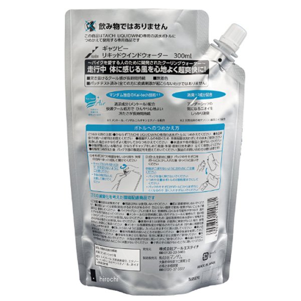 RSタイチ ギャツビーリキッドウインド ウォーター容量:300ml男性用化粧品メーカーである株式会社マンダムとの共同開発で誕生した、LIQUIDWIND専用設計の冷却水。冷却水はマンダム独自の「Kai-tech Air(快テックエアー)技術」により、清涼成分(メントール)配合の快適クール処方でひんやり心地よい冷たさが長時間持続します。さらに、ダブルの消臭成分を配合し、無香料でベタつきも気にならず、乗車中も快適な使用感です。LIQUIDWINDスプレーボトルに詰め替えてご使用ください。ご使用いただく際には、別売りの・ RSP505 リキッドウインド 保冷ボトルキット・ RSU500 リキッドウインド アンダーシャツ・ RSU501 リキッドウインド エアフローベスト(推奨)を併用ください。