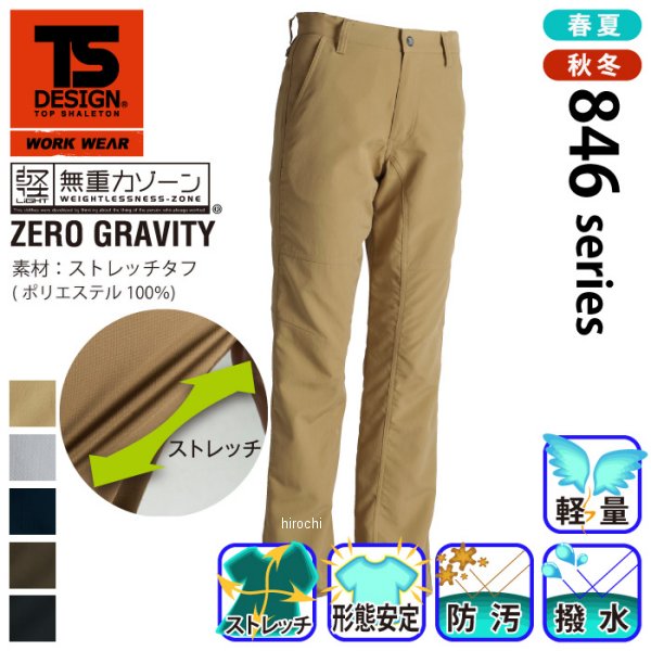 TSデザイン ストレッチタフメンズパンツサイズ:Mカラー:シルバーグレー素材:ストレッチタフ(ポリエステル100%)ZERO GRAVITY 846シリーズ 【高強度】【ストレッチ】 耐久性とストレッチ性に優れたタフモデル。 ストレッチ性に優れ、より強度を高めたタフ素材。 軽量で横・斜めへの伸縮性が高く、動きやすさ抜群。 生地裏は凹凸で、汗のベタ付き感を軽減してくれます。素材は中厚手でオールシーズン使用可能! 股上やや深めのノータックと適度なフィット感でスタイリッシュに着こなせます。高強度のタフ素材を使用しているので現場等ハードワークのユニフォームにも、運送・ドライバーの作業服にも最適てす。カラー展開が豊富なのも魅力で企業イメージに合わせて選べるので、サービスユニフォームとしてもおススメできます。毎日使うものだから、防汚機能や撥水加工で付いた汚れが落ちやすいのも便利です。藤和の[TS DESign]ならスポーツウエアの技術をフィードバックしているから、快適・安心に着用できます。