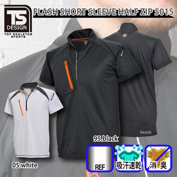 TSデザイン FLASH ショートスリーブハーフジップサイズ:SSカラー:ブラック素材:ポリエステル100%吸汗速乾に優れた、ドライメッシュを使用しています。カラーバリエーションは、ホワイト、ブラックの2色で、落ち着きのあるカラーでの展開となっております。オレンジのファスナーがアクセントとなって、ワンポイントでオシャレを楽しめます。また、ホワイトは、肩部にもラインが入っており、2トーンカラーを楽しめます。サイズはSSサイズ~6Lサイズまでの、9サイズでの展開となっておりますので、幅広い体型の方にお選びいただけます。フラットシーマ―仕様なので、縫い目が平らに仕上げてあり、ごろつき感を解消してくれます。見た目も、かっこよくシャープなシルエットとなっております。左袖部分には、マルチスリーブポケットが付いていますので、いつでもサッとペンの出しれができますので、作業の効率化につながります。他にも、吸汗速乾機能で、通気性にすぐれており、気になる汗のにおいも消化してくれます。衿裏と、左袖には、反射テープも付いております。フロントハーフジップも、反射テープ仕様となっております。