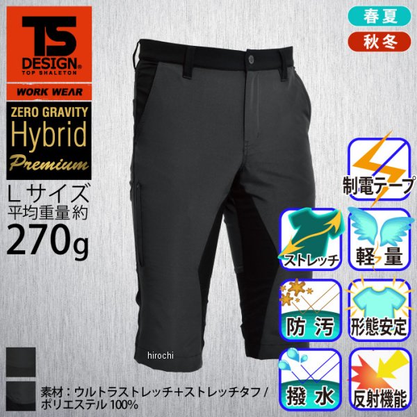 TSデザイン ハイブリッドストレッチメンズショートパンツサイズ:Lカラー:ブラック/チャコールグレー素材:ウルトラライトストレッチ+ストレッチタフ(ポリエステル100%)仕様:ファスナーポケット、左右ヒップポケット、反射プリント、(ブラック/ブラックのみ)蛍光カン止め強度と軽量を両立したワークショートパンツ。軽量かつ耐久性。とにかく軽い!そして現場で思う存分酷使できるほど高い耐久性。