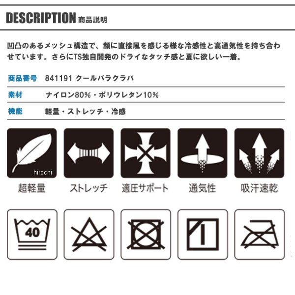 TSデザイン バラクラバアイスマスクニンジャサイズ:フリーカラー:ハニカム素材:クールアイス(ナイロン80%・ポリウレタン20%)機能:ストレッチ、接触冷感、適圧サポート、吸汗速乾、UVカット、メッシュ仕様