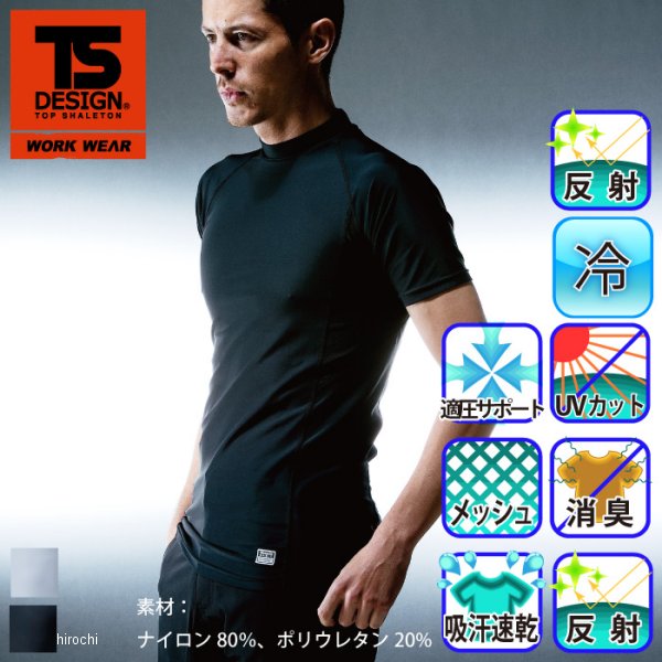 TSデザイン ハイネックショートスリーブシャツサイズ:3Lカラー:ブラック素材:ナイロン80%、ポリウレタン20%ソフトコンプレッションインナー・ソフトコンプレッションウェア メンズ 半袖ハイネックシャツ は、ナイロン80%・ポリウレタン20%を 使用した、クールアイス素材のショートスリーブシャツです。メッシュ部分は、ポリエステル85%、ポリウレタン15%使用です。伸縮性のよい素材となっており、素早く汗を吸収して、素肌を乾いた状態に保ってくれます。表面はすべりが良く、重ね着がスムーズです。フリーストレッチなので、縦、横2方向への伸縮性が高く、動きやすいのが特徴です。UV(99%カット)なので、素肌を紫外線から守ります。フラットシーマ―仕様なので、縫い目が平らに仕上げてあり、ごろつき感を解消してくれます。カラーバリエーションは、ブラック、ホワイトの定番な2色での展開となっております。シンプルなカラー展開なので、どのような場面でもお使いいただけます。サイズは、Sサイズ~3Lサイズの5サイズでの展開となっておりますので、幅広い体型の方にお選びいただける商品となっております。背中には、TS DESIGNロゴの反射プリントがついており、メッシュ素材で出来ていますので、通気性が良く、ベタツキを防ぎます。他にも、消臭機能や、敵圧サポート等、色々な機能が充実しています。
