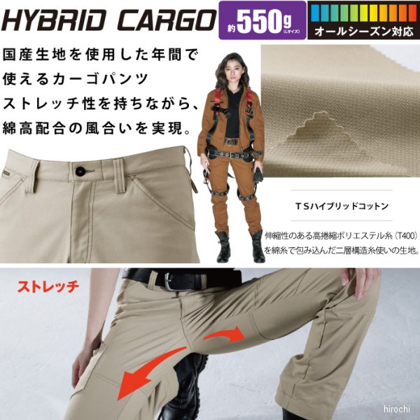 TSデザイン ハイブリッドコットンレディースカーゴパンツサイズ:Sカラー:キャメル素材:TSハイブリッドコットン(綿80%、ポリエステル20%)TSハイブリッドコットンシリーズ 常に進化し続けるTS DESIGNが構想に2年かけ多数の試作を経て、ポリエステル芯を綿で包み、ストレッチ二層構造糸による新素材が実現した高耐久ストレッチ素材「TSハイブリッドコットン」。素材の選択肢からあえてポリウレタンを外し、ストレッチ性の低下や、ひざ抜け等のリスクを軽減させました。国産生地を使用した年間で使える素材はストレッチ性を持ちながら、綿100%の風合いを実現しています。
