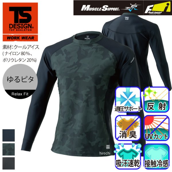 TSデザイン ロングスリーブシャツサイズ:Mカラー:ブラック/チャコールグレー素材:ナイロン80%・ポリウレタン20%春夏対応の、メンズ用ロングスリーブシャツ は、 クールアイス素材(ナイロン80%、ポリウレタン20%の伸縮性のよい素材となっており、素早く汗を吸収して、素肌を乾いた状態に保ってくれます。表面はすべりが良く、重ね着がスムーズです。フリーストレッチなので、縦、横2方向への伸縮性が高く、動きやすいのが特徴です。UV(99%カット)なので、素肌を紫外線から守ります。フラットシーマ―仕様なので、縫い目が平らに仕上げてあり、ごろつき感を解消してくれます。カラーバリエーションは、ブラック×チャコールグレー、ブラック×迷彩、ブラック×ブラックの、3色で展開となっており、 シンプルなブラック×ブラックから、ひと手間加えたブラック×迷彩カラーなど、好みのカラーをお選びいただけます。サイズは、Sサイズ~3Lサイズの5サイズでの展開となっておりますので、幅広い体型の方にお選びいただける商品となっております。背中には、TS DESIGNロゴの反射プリントがついております。左袖には、マルチスリーブポケットが付いていますので、 いつでもどこでもサッとペンを出し入れでき、仕事の効率化にもつながる仕様となっております他には、消臭機能や、敵圧サポート等、色々な機能が充実しています。