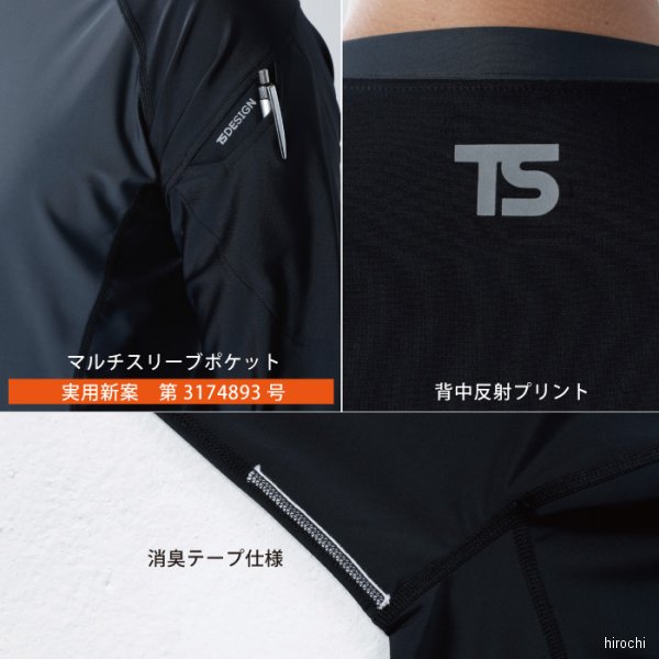 TSデザイン ロングスリーブシャツサイズ:3Lカラー:ブラック/迷彩素材:ナイロン80%・ポリウレタン20%春夏対応の、メンズ用ロングスリーブシャツ は、 クールアイス素材(ナイロン80%、ポリウレタン20%の伸縮性のよい素材となっており、素早く汗を吸収して、素肌を乾いた状態に保ってくれます。表面はすべりが良く、重ね着がスムーズです。フリーストレッチなので、縦、横2方向への伸縮性が高く、動きやすいのが特徴です。UV(99%カット)なので、素肌を紫外線から守ります。フラットシーマ―仕様なので、縫い目が平らに仕上げてあり、ごろつき感を解消してくれます。カラーバリエーションは、ブラック×チャコールグレー、ブラック×迷彩、ブラック×ブラックの、3色で展開となっており、 シンプルなブラック×ブラックから、ひと手間加えたブラック×迷彩カラーなど、好みのカラーをお選びいただけます。サイズは、Sサイズ~3Lサイズの5サイズでの展開となっておりますので、幅広い体型の方にお選びいただける商品となっております。背中には、TS DESIGNロゴの反射プリントがついております。左袖には、マルチスリーブポケットが付いていますので、 いつでもどこでもサッとペンを出し入れでき、仕事の効率化にもつながる仕様となっております他には、消臭機能や、敵圧サポート等、色々な機能が充実しています。