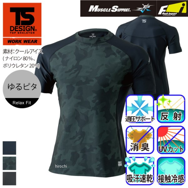 TSデザイン ショートスリーブシャツサイズ:3Lカラー:ブラック/迷彩素材:ナイロン80%、ポリウレタン20%春夏対応の、メンズ用ショートスリーブシャツ は、 クールアイス素材(ナイロン80%、ポリウレタン20%の伸縮性のよい素材となっており、素早く汗を吸収して、素肌を乾いた状態に保ってくれます。表面はすべりが良く、重ね着がスムーズです。フリーストレッチなので、縦、横2方向への伸縮性が高く、動きやすいのが特徴です。UV(99%カット)なので、素肌を紫外線から守ります。フラットシーマ―仕様なので、縫い目が平らに仕上げてあり、ごろつき感を解消してくれます。カラーバリエーションは、ブラック×チャコールグレー、ブラック×迷彩、ブラック×ブラックの、3色で展開となっており、 シンプルなブラック×ブラックから、ひと手間加えたブラック×迷彩カラーなど、好みのカラーをお選びいただけます。サイズは、Sサイズ~3Lサイズの5サイズでの展開となっておりますので、幅広い体型の方にお選びいただける商品となっております。背中には、TS DESIGNロゴの反射プリントがついております。左袖には、マルチスリーブポケットが付いていますので、 いつでもどこでもサッとペンを出し入れでき、仕事の効率化にもつながる仕様となっております。他には、消臭機能や、敵圧サポート等、色々な機能が充実しています。