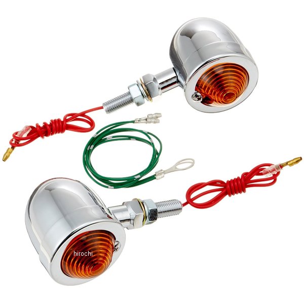 ポッシュ POSH ミニブレットウインカー汎用ボディカラー:ニッケルレンズカラー:オレンジサイズ:φ51x74x70mm取付け部ネジ寸法:M10x30mm入数:2個アメリカンカスタムのスタンダードニッケル、ニッケルミニ、ブラックミニの3種をラインナップG18型12V21バルブ付き。シングルソケットタイプ。アース線付き
