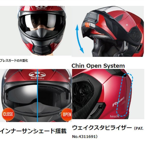 オージーケーカブト OGK KABUTO システムヘルメット RYUKI ビームサイズ:M(57-58㎝) カラー:フラットブラックグレー【標準装備品】標準装着シールド:CM-2-P UICシールド(UICクリア)標準インナーサンシェード:CM-2インナーサンシェード(スモーク)ウィンドウシャッターNo.6ブレスガードNo.11【仕様説明】UV(紫外線)とIR(赤外線)をカットする、帝人株式会社の高機能ポリカーボネートをシールド素材として用いた『UV&IRカットシールド』を採用。太陽光の赤外線(IR)で発生する日射熱による温度上昇を抑制する熱線遮蔽性能があり、ヘルメット用シールドでは最も重要な「クリアな視認性」を保ったまま、ヘルメット内部への熱伝導を低減させます。※白熱灯(300W)を照射してヘルメット内の温度を社内にて測定・インカム取付を考慮した、専用取付スペースを設置インカムやカメラを考慮した専用取付スペースを予め左右に設定。※一部特殊な形状は取付不可・軽量化を実現パーツレイアウトや装飾処理を見直すことで、従来のシステムタイプより軽量化を実現。・ブレスガードの大型化エア吹き出し面とブレスガードの大型化により換気性能の効率アップとともに視界の明るさも抑制。・Chin Open Systemチンカバー中央下部のロックレバーを操作することで、チンカバー部分のオープンが可能となるチン・オープンシステムを採用しています。・インナーサンシェード搭載照り返しの強い朝夕、日差しが強い昼間は、スモークレンズ効果で眩しさを低減する開閉可能な「インナーサンシェード」を搭載しています。・ウェイクスタビライザー(PAT. No.4311691)帽体付近の気流をコントロールし、負荷を軽減するKabutoの特許システム。・CM-2 シールドシステムシールドメカのレバーを引くだけでシールドのスピーディな交換が可能。・CM-2-P PinlockR Original Insert Lensワイドタイプの100%MAXVISIONピンロックシート(別売)を装着可能。・エアベンチレーション操作しやすい形状を採用し計3ヶ所のベンチレーションより効率良く冷気を導入、ヘルメット内部のエアを排出します。※リアベンチレーションに開閉機能はありません。・眼鏡対応チークパッド眼鏡やサングラスをスムーズにかけられる、チークパッド形状を採用。ベストなポジションで眼鏡やサングラスを使用できます。※メガネの形状や、顔の形により個人差があります。・内装フル脱着システム「インナー脱着システム」を採用、内装はすべて取り外してまるごと洗うことができます。※インナー・チーク・あごひもカバー・ウィンドシャッターNo.6走行中に発生するあご付近からの風の巻き込みを軽減。季節や用途に応じてお好みで脱着可能。・マイクロラチェットバックルワンタッチで脱着、微調整が可能なマイクロラチェットバックル採用。複数の噛み合いにより、確実な作動と安全性を実現。【規格】SG(自動二輪車用)