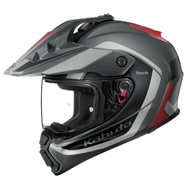 オージーケーカブト OGK KABUTO フルフェイスヘルメット GEOSYS BLOCK サイズ:Lカラー:フラットガンメタレッド【標準装備品】標準装着シールド(品番:CD-1シールド カラー:クリア)【同梱品】ウィンドシャッターNo.8過酷な状況でいかに快適さを体感出来るか。ライダーの要求を徹底的に研究したエクステリア、インテリアデザイン。操作しやすく、開口の大きいシーソー式ヘッドベンチレーション。大開口のヘッドベンチレーションはグローブをしていても操作しやすいシーソー式でスムーズな開閉操作が可能。曇り除去用と口元換気用を分けたチンベンチレーション。シールドの曇り除去用と口元の換気用にチンベンチレーションを分割。効率の良い通気性を生み出し、運動量の多いオフロード走行でもヘルメット内を快適に保ちます。空気抵抗を抑えるバイザー形状を採用、可動式により5段階で視野調整が可能。スタイルによって5段階のバイザー角度調整が可能。また空気抵抗を抑えるバイザー形状を採用。シールドを装着したままゴーグルの使用が可能。オフロード走行を想定しゴーグルに対応したデザイン設計。シールドを装着したままゴーグルを取り付けることができ、気軽にスタイルを変更することができます。※ゴーグルは市販の商品をお買い求めください。※一部特殊な形状は取付不可。バイザーを装着したままシールド脱着が可能。バイザーを装着したままでもシールド脱着可能なラチェットシステムを採用。簡単にシールドのメンテナンスを行うことができます。シェル一体型ウェイクスタビライザー。走行中発生する帽体付近の気流をコントロールし、負荷を軽減するKabutoの特許システム。・高強度複合素材帽体 A.C.T.(Advanced Composite Technology)耐貫通性と衝撃吸収性を兼ね備えた高強度複合素材帽体(A.C.T.)を導入し各部の強度を最適化。・防眩/泥石避けを配慮した穴形状を取り入れたバイザー防眩、泥石避けとしての性能を損なわずに走行風を受け流す通気口を取り入れています。・Pinlock? Original Insert Lens 対応外気温とヘルメット内部の温度差を平衡に保ち、シールドの曇りを抑えます。・眼鏡対応チークパッド眼鏡やサングラスをスムーズにかけることができるチークパッド形状を採用。※メガネの形状や、顔の形により個人差があります。・内装フル着脱可能内装は全て取り外して洗うことも可能。・COOLMAX?肌触りのよいCOOLMAX?生地を一部に使用。・「制菌加工」内装 DEOFACTOR?インナーパッド表地に繊維上の細菌の増殖を抑制するDEOFACTOR?の「制菌加工」を採用。・ウィンドシャッターNo.8 同梱走行中に発生するあご付近からの風の巻き込みを軽減する脱着可能なウィンドシャッターを同梱。・ライディングに集中できる安定した静寂性新形状のCD-1シールドラチェット採用により密閉性と静粛性を向上。・スピーカー専用スペース脱着式イヤーカップを採用し、インカムスピーカー用スペースを予め左右に設定。【規格】JIS、MFJ公認【届出事業者】株式会社オージーケーカブト【検査機関】一般財団法人製品安全協会