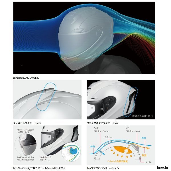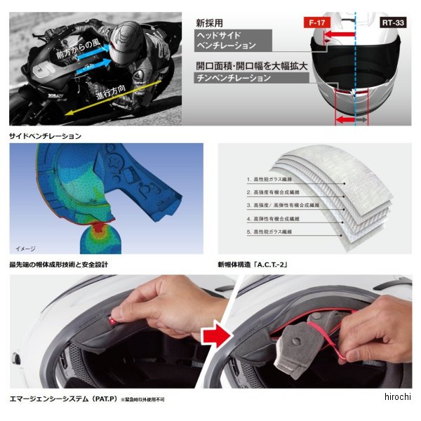 オージーケーカブト OGK KABUTO フルフェイスヘルメット F-17 ZESTALサイズ:XXL(63cm-64cm)カラー:ブラックグリーン規格:JIS、MFJ公認(MFJが主催する競技での使用を認めたことを証明する、MFJ公認商品です。)【仕様説明】レーシングの迫力を引き立てる、ダイナミックで先進的なグラフィックデザイン。最先端のエアロフォルムCFD(3次元数値流体解析)を駆使して開発されたKabuto独自の空力デバイス「ウェイクスタビライザー(PAT.NO.4311691)」と、極限まで絞り込んだ前面投影面積を採用した帽体により、直進時だけではなく横風や後方確認時の空気抵抗を低減。さらに走行風で発生するヘルメットが浮き上がろうとする力を抑制し、優れた空力性能に大きく寄与するデバイス「クレストスポイラー(PAT.P)」の新採用など、最先端のエアロフォルムは、あらゆる速度域での高い集中力維持に大きく貢献します。クレストスポイラー(PAT.P.)ヘルメット上部の気流をあえて乱すことにより浮き上がろうとする力を抑え、F-17本来の優れた空力性能にも寄与するデバイスです。幅広い角度で効果が発揮される弓状の形状を採用し、もっとも顕著に効果が確認できたデバイスサイズとしています。ウェイクスタビライザー(PAT.)走行中発生する帽体付近の気流をコントロールし、負荷を軽減するKabutoの特許システム。長年にわたる研究・風洞実験を重ね生まれました。気流をコントロールし、揚力や空気抵抗を低減。高速走行時にヘルメットの安定感を高めます。最先端の帽体成形技術と安全設計優れた耐貫通性と衝撃吸収性を兼ね備えた高強度複合素材帽体(A.C.T.-2)を採用するとともに、FEM(有限要素法)構造解析を導入し各部の強度を最適化。安全性と首への負担を低減するその驚異的な軽さは、あらゆる状況においてライダーの負担を軽減。新帽体構造「A.C.T.-2」定評あるA.C.T.構造をさらに進化させた「A.C.T.-2」構造を採用。厳しい耐貫通性能が求められるMFJの安全基準を高次元でクリアしながら更にチンガード部分にも高強度有機繊維を配置し、帽体強度を更に向上。サイドベンチレーションコーナリング姿勢でも効率よく風を捉え、直進時の姿勢と同等のエア導入を目的としたサイドベンチレーションを採用。開口面積・開口幅ともに大幅拡大したチンベンチレーションと相まって、常にヘルメット内部へフレッシュなエアを取り込みます。センターロック/二軸ラチェットシールドシステム2軸構成の新型「DAF-Rラチェット」、素早い交換が可能なDAF-1Rシールド、新形状の一体式トリムラバーの採用により密閉性と静粛性を向上。また大型レバーを備えたセンターロック式で、グローブを装着したままでも確実に開閉可能です。トップエアロベンチレーション整流効果と同時に、ヘルメット内部にこもった熱気を放出するKabuto独自のシステム。シェル内部を通過してリアベンチレーションフィンに設けられたエア排出路へとつながるエアルートを確保し、優れた換気性能と軽量化を両立。※リアベンチレーションに開閉機能はありません。過酷な状況下で徹底的に検証された、「着脱のしやすさ」と「極上のかぶり心地」独自の空間認知技術採用など、設計思想から見直した内装は、サポートライダーの多くが「従来品よりもかぶり心地が良くなった」と回答。「点のフィット感から包み込むフィット感」への転換が極上のかぶり心地を実現。「制菌加工」内装 ※一部に使用インナーパッド表地に、繊維上の細菌の増殖を抑制する、DEOFACTORの「制菌加工」を採用。DEOFACTORは制菌作用により、衣類や繊維製品に付着する有害物質を分解します。※DEOFACTORはKOKORO CAREが開発した特殊加工技術です。エマージェンシーシステム(PAT.P)※緊急時以外使用不可アクシデント発生時に、救助者が簡単かつ素早く安全にヘルメットを脱がさなければならない状況でも、内装ウレタン材を引き抜く方式により頬に当たる生地はそのまま残り、スムーズでライダーへの負担も少ないKabutoの独自構造です。※サイズはあくまで目安です。製品の設計により同じサイズ表示でも装着感が異なる場合があります。