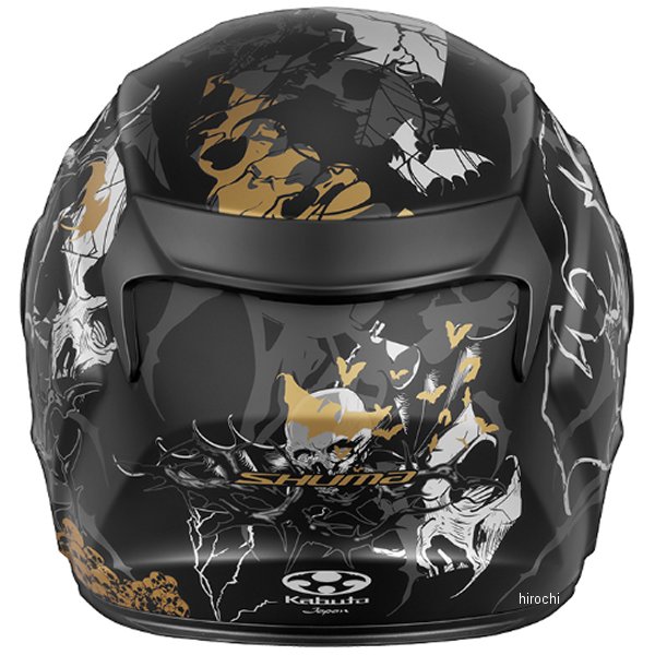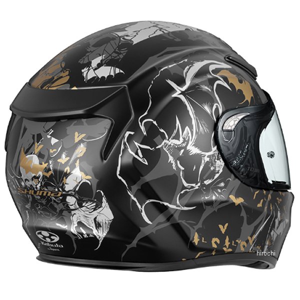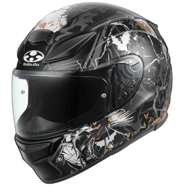 オージーケーカブト OGK KABUTO フルフェイスヘルメット SHUMA NIGHTERサイズ:L(59cm-60cm)カラー:フラットブラックゴールド規格:JIS【仕様説明】静夜を支配するコウモリをモチーフにしたダークな世界観が、アシンメトリースタイルと融合し圧倒的な存在感を放つ。ウルトラクーリングシステム走行した瞬間から風を感じることが出来る、新設計のクーリングシステム。ベンチレーションホールを、風洞実験やCFD解析により、走行時のヘルメットの角度に最適な向きになる様配置。低速域から風を感じる事ができるインパクトのある涼しさを実現。(左)走行開始から30秒ほどの速さで涼しさを体感できることを風洞実験で実証。(右)ベンチレーションの数、位置、角度、形状など、幾つものパターンを予め想定・検証した結果を元に最適な組み合わせを割り出して開発された新設計チンベンチレーションは、エア導入を二手に分け、上方向へはシールドの曇りを軽減し、正面方向へは口元へダイレクトにエアを取り入れ、今までにない涼しさを実現。※リアベンチレーションに開閉機能はありません。新感覚のフィッティングで風が通り抜ける内装(HEXA-PAD)ヘルメット内側と頭部の空間をデータ化し内装厚み分布を最適化し、生地の大部分をホットプレス加工により厚みに強弱をつけることで、縫い目が少ない新感覚のシームレスなフィッティングで、風が通り抜ける涼しさが体感できます。「制菌加工」内装 ※一部に使用インナーパッド部分に、繊維上の細菌の増殖を抑制する、DEOFACTORの「制菌加工」を採用。DEOFACTORは制菌作用により、衣類や繊維製品に付着する有害物質を分解します。※DEOFACTORはKOKORO CAREが開発した特殊加工技術です。帝人株式会社 熱線遮蔽素材使用「UV&IRカットシールド」採用UV(紫外線)とIR(赤外線)をカットする、帝人株式会社の高機能ポリカーボネートをシールド素材として用いたUV&IRカットシールドを採用。太陽光の赤外線(IR)で発生する日射熱による温度上昇を抑制する熱線遮蔽性能があり、ヘルメット用シールドでは最も重要な「クリアな視認性」を保ったまま、ヘルメット内部への熱伝導を低減させます。※白熱灯(300W)を照射してヘルメット内の温度を社内にて測定インカム取付を考慮した、専用取付スペースを設置インカムやカメラを考慮した専用取付スペースを予め左右に設定。ケーブルルートも同時に設置しており、スピーカーなどからのコードもスマートな配線が可能となりました。※一部特殊な形状は取付不可ウェイクスタビライザー PAT.帽体付近の気流をコントロールし、負荷を軽減するKabutoの特許システム。ウィンドシャッターNo.7走行中に発生するあご付近からの風の巻き込みを軽減。季節や用途に応じてお好みで脱着可能。ブレスガード No.9シールド裏面への吹き出し面積を拡大した新設計ブレスガードを採用。シールドの曇り除去に貢献します。マイクロラチェットバックルワンタッチで脱着、微調整が可能なマイクロラチェットバックル採用。複数の噛み合いにより、確実な作動と安全性を実現。※サイズはあくまで目安です。製品の設計により同じサイズ表示でも装着感が異なる場合があります。