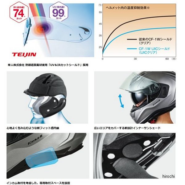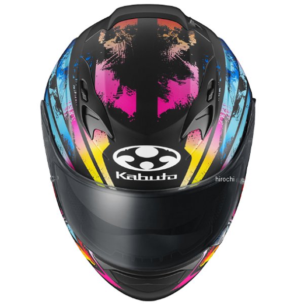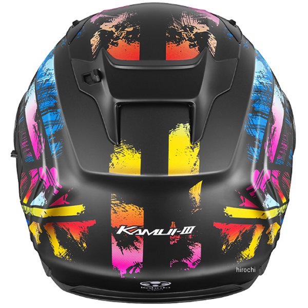 オージーケーカブト OGK KABUTO フルフェイスヘルメット KAMUI-3 PRISMAサイズ:S(55cm-56cm)カラー:フラットマルチカラー規格:JIS【仕様説明】光のプリズムが生み出す幻想的な煌めきが、走りに躍動を与える神秘的なグラフィックモデル。帝人株式会社 熱線遮蔽素材使用「UV&IRカットシールド」採用UV(紫外線)とIR(赤外線)をカットする、帝人株式会社の高機能ポリカーボネートをシールド素材として用いたUV&IRカットシールドを採用。太陽光の赤外線(IR)で発生する日射熱による温度上昇を抑制する熱線遮蔽性能があり、ヘルメット用シールドでは最も重要な「クリアな視認性」を保ったまま、ヘルメット内部への熱伝導を低減させます。※白熱灯(300W)を照射してヘルメット内の温度を社内にて測定インカム取付を考慮した、専用取付スペースを設置インカムやカメラを考慮した専用取付スペースを予め左右に設定。ケーブルルートも同時に設置しており、スピーカーなどからのコードもスマートな配線が可能となりました。※一部特殊な形状は取付不可心地よく包み込むような新フィット感内装スムーズな着脱と首元までソフトに包み込まれる心地よいフィット感を両立しています。広いエリアをカバーする新設計インナーサンシェード照り返しや日差しが強いシーンで威力を発揮する、専用設計の大型インナーサンシェードを標準装備。操作しやすいベンチレーション操作しやすい形状を採用し計4カ所のベンチレーションより効率良く冷気を導入、ヘルメット内部のエアを排出。ウェイクスタビライザー PAT.No.4311691帽体付近の気流をコントロールし、負荷を軽減するKabutoの特許システム。ブレスガードNo.9シールド裏面への吹き出し面積を拡大した新設計ブレスガードを採用。シールドの曇り除去に貢献します。ダブルアクションタイプ マイクロラチェットバックル確実な作動と、複数の噛み合い爪で微調整を可能にしたKabuto独自のマイクロラチェットバックル。※サイズはあくまで目安です。製品の設計により同じサイズ表示でも装着感が異なる場合があります。