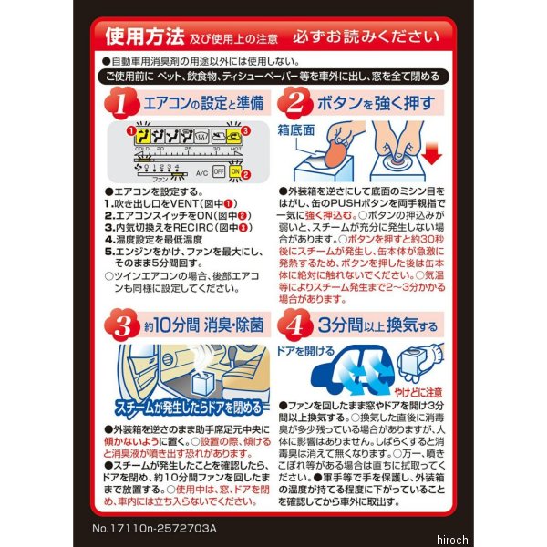 カーメイト ドクターデオプレミアム スチームタイプ 循環無香タイプスチームに含まれる消臭成分がエアコンの内部までスピード消臭。さらに菌・ウイルスも強力除去。消臭成分に病院やレストランで業務用として使われている安定化二酸化塩素を採用。強力&安心設計。作業も簡単でPUSHボタンを押すだけです。