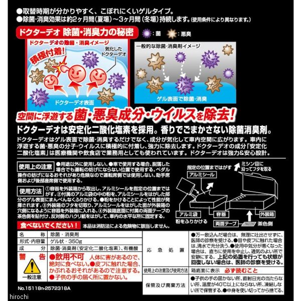 カーメイト ドクターデオプレミアム シート下タイプ 大型内容量:350g×2個セット持続期間:約2~3ヶ月無香タイプ従来品比200%の消臭性能を実現。除菌消臭成分に安定化二酸化塩素を採用。悪臭成分を酸化分解し、強力除菌&消臭。シートの下に置くだけで目立たない所からしっかり消臭。ミニバンに最適な大型サイズです。