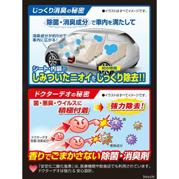 カーメイト ドクターデオプレミアム スチームタイプ 浸透無香タイプスチームに含まれる消臭成分がシート・内装の内部までごっそり消臭。さらに菌・ウイルスも強力除去。消臭成分に病院やレストランで業務用として使われている安定化二酸化塩素を採用。強力&安心設計。作業も簡単でPUSHボタンを押すだけ換気不要です。