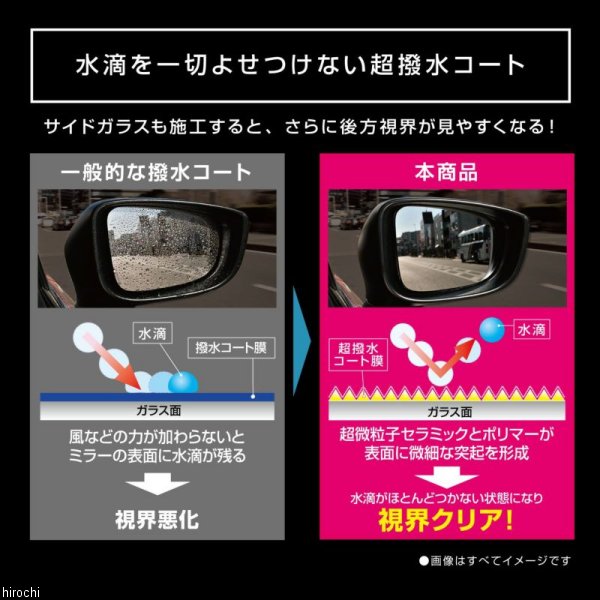 カーメイト エクスクリア 超撥水ミラーコート内容量:液体・ NET80Ml用途:自動車用ミラー・ガラスコーティングの撥水用成分:アルコール類、シリカ火気厳禁 第四類アルコール類 危険等級II 72Ml本品は、超微粒子セラミックとポリマーがミラー表面に微細な突起を形成し、水滴がほとんど付かない状態になり視界がクリアになります。ミラーの雨対策にお勧めです。ミラーにスプレーするだけなので誰でも簡単に使用できます。※本製品は車外ミラー・ガラス専用です。用途以外に使用しないで下さい。※着色、親水、撥水、ワイパー付き、超音波等の特殊サイドミラー、ガラス以外のサイドミラーには使用しないで下さい。