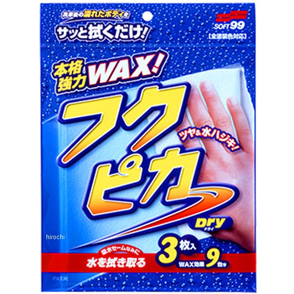 ソフト99コーポレーション フクピカドライ容量:3枚洗車後、ボディの水を拭き取るだけでワックスがけも完了。特殊加工のハイテククロスが、ボディについた水気をグングン吸い取り、同時に固形ワックスにも匹敵するワックス被膜を形成します。水で絞って使えば、乾いたボディにも使用できます。