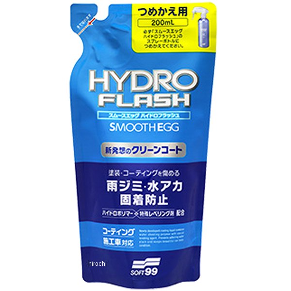 ソフト99コーポレーション スムースエッグ ハイドロフラッシュ 200つめかえ用容量:200ml雨天後の雨ジミの固着を防止できる新機能を搭載した、全く新しい疎水性コーティング剤、スムースエッグ ハイドロフラッシュのお得なつめかえ用です。省資源化とゴミの削減に配慮したパウチタイプです。注ぎ口はハサミを使わず手で開けられ、ボトルにつめかえやすいよう細くこぼれにくくなっています。