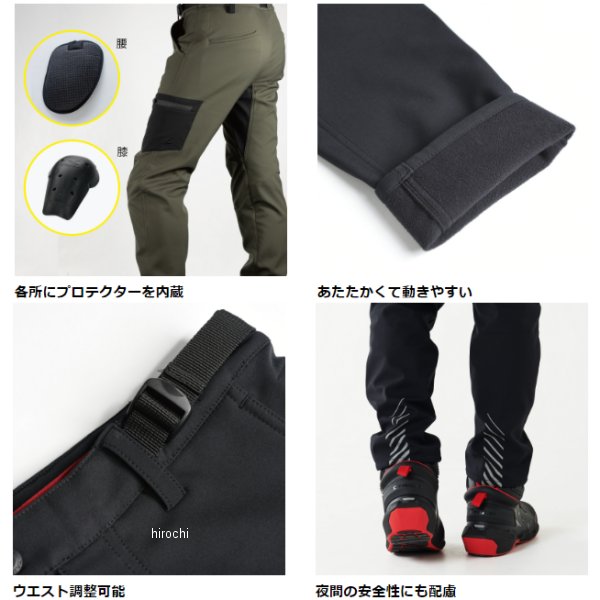 RSタイチ 秋冬モデル ウインドストップ ソフトシェル パンツ レディースサイズ:WMカラー:ブラック標準装備プロテクター:膝、腰【素材】表地:ポリエステル100%裏地:ポリエステル100%【仕様説明】防風性、ストレッチ性に優れたソフトシェル生地を表地に、肌触りの良いフリース生地を裏地として採用。保温性を確保しながらも、やわらかい着心地でライディングフォームに追従する、直履きタイプのライディングパンツです。膝には高い衝撃吸収性能と柔軟性に優れたCEレベル2プロテクター、腰の両サイドにはフォームパッドを装備。フォームパッドは別売品プロテクターでアップグレード可能です。両サイドのベルトにより、ウエストサイズの調節が可能です。ベルトポーチやカラビナ等を吊り下げるのに便利なベルトループも装備。夜間走行時の被視認性確保のため、反射材を装備。※本製品はRSタイチ社製他のライディングパンツよりもスリムなフィット感となっております。【機能】・防風仕様・ストレッチ素材・ 夜間の被視認性を高めるリフレクター・CEレベル2タイププロテクター(膝)