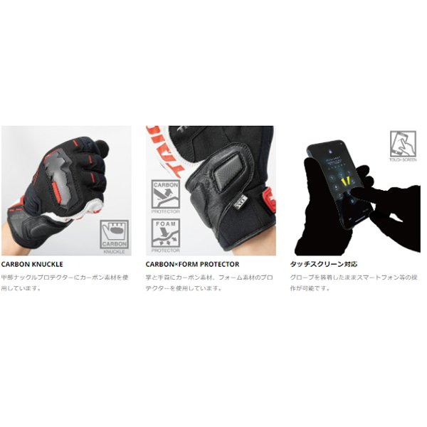 RSタイチ 秋冬モデル アームド ウインターグローブ レディースサイズ:WLカラー:ブラック/レッドプロテクター:甲、掌【仕様説明】運動性を高めるために掌側の中綿を当社比で少なめにした、操作性No.1のスポーティウインターグローブ。防水仕様で雨天時の着用も可能。 掌と手首のプロテクターにカーボン素材を、甲にはレーシンググローブ譲りのカーボンナックルプロテクターを採用。指先にネオプレン素材を使用し、ストレッチ性を高めました。グローブを装着したままスマートフォン等の操作が可能です。【機能】・カーボンプロテクション(甲・掌側)・革補強(小指側)・滑り止めプリント(人差し指・中指)・防水透湿(DRYMASTER)・タッチスクリーン対応