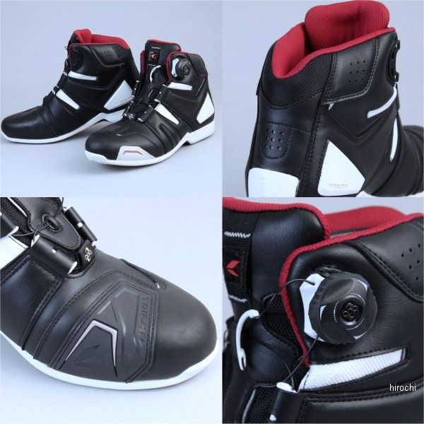 RSタイチ RSTaichi ドライマスター ボア ライディングシューズカラー:ブラック/ホワイトサイズ:23.0cm素材:合成皮革・牛革・ナイロン・ドライマスターインサート・ポリエステル着脱性、フィット感に優れるボアシステムとドライマスターの防水・透湿機能を融合した最強のライディングシューズ防水/透湿機能を兼ね備えるドライマスターと、Boaクロージャーシステムを融合。アウトサイドに配置したBoaリールは操作性を高めました。ソールには高いグリップと柔軟性に富むオリジナルソールを採用し、衝撃吸収材を内蔵したインソールとの相乗効果により、ライディング時はもとより、歩行時にも抜群の履き心地を実現。デニムはもちろんのこと、レザーパンツにもマッチする次世代のライディングシューズです。・ダイヤル操作のみで高いフィット感が得られる BOAクロージャーシステム・高い防水・透湿性のDRYMASTERブーティを使用・転倒時にダメージを受けやすいつま先、アウトサイド、ヒール、くるぶしには成形プロテクターを使用・アウターには強度と柔軟性に優れる合成皮革を使用・しなやかさと高いグリップ力と適度なクッション性を発揮と快適な履き心地を実現するオリジナルソール・反射効率に優れる再帰反射リフレクター(ヒール・アウトサイド)