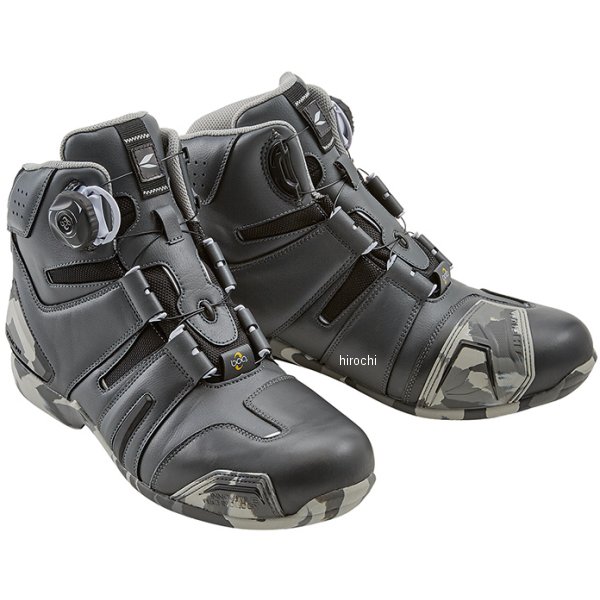 RSタイチ RSTaichi ドライマスター ボア ライディングシューズサイズ:26.5cmカラー:アーバン/カモ素材:合成皮革・牛革・ナイロン・ドライマスターインサート・ポリエステル着脱性、フィット感に優れるボアシステムとドライマスターの防水・透湿機能を融合した最強のライディングシューズ防水/透湿機能を兼ね備えるドライマスターと、Boaクロージャーシステムを融合。アウトサイドに配置したBoaリールは操作性を高めました。ソールには高いグリップと柔軟性に富むオリジナルソールを採用し、衝撃吸収材を内蔵したインソールとの相乗効果により、ライディング時はもとより、歩行時にも抜群の履き心地を実現。デニムはもちろんのこと、レザーパンツにもマッチする次世代のライディングシューズです。・ダイヤル操作のみで高いフィット感が得られる BOAクロージャーシステム・高い防水・透湿性のDRYMASTERブーティを使用・転倒時にダメージを受けやすいつま先、アウトサイド、ヒール、くるぶしには成形プロテクターを使用・アウターには強度と柔軟性に優れる合成皮革を使用・しなやかさと高いグリップ力と適度なクッション性を発揮と快適な履き心地を実現するオリジナルソール・反射効率に優れる再帰反射リフレクター(ヒール・アウトサイド)