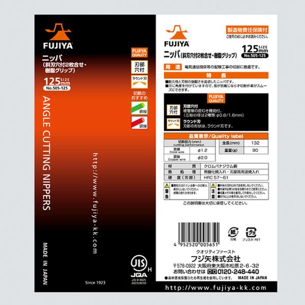 ・電気・通信工事での配線の切断作業に最適です。・刃に角度を付けていますので、指が邪魔にならず切断作業がスムーズにできます。・ビニール線のストリップ作業に便利な穴付です。・電気・通信工事で配線の切断作業に最適です。・刃に角度を付けていますので、指が邪魔にならず切断作業がスムーズに出来ます。・ビニール線のストリップ作業に便利な穴付きです。・AV・通信・精密機器の組立、配線、内線工事用に。・全長(mm):132・切断能力(mm)鉄線:φ1.2・切断能力(mm)銅線:φ2.0・ラウンド刃・皮ムキ穴付(0.8mm、1.6mm)・JIS B4625JQ0508059・ROHS対応・特殊鋼・グリップ:樹脂・能力以上の使用はしないで下さい。・電気が流れている物への切断は絶対にしないで下さい。・生産国 日本・JANコード 4952520005651・質量 100g・コード:117-9152 ・品目:505125