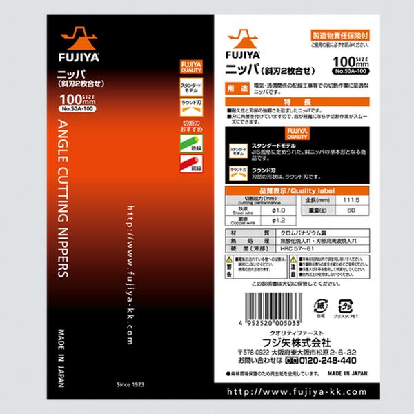 ・電気・通信工事での配線の切断作業に最適です。・刃に角度を付けていますので、指が邪魔にならず切断作業がスムーズにできます。・AV・通信・精密機器の組立、配線、内線工事用に。・全長(mm):111.5・切断能力(mm)鉄線:φ1.0・切断能力(mm)銅線:φ1.2・ラウンド刃・厚刃・ROHS対応・特殊鋼・グリップ:樹脂・能力以上の使用はしないで下さい。・電気が流れている物への切断は絶対にしないで下さい。・生産国 日本・JANコード 4952520005033・質量 60g・コード:276-3281 ・品目:50A100