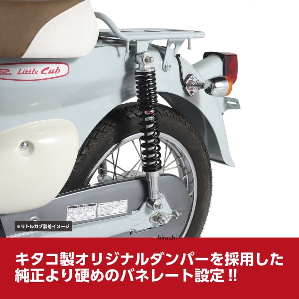キタコ KITACO リアショックセット09年-11年 ホンダ スーパーカブ11092年-08年 ホンダ スーパーカブ5086年-99年 ホンダ スーパーカブ7086年-08年 ホンダ スーパーカブ9086年-99年 ホンダ スーパーカブ90 カスタム97年-16年 ホンダ リトルカブ2本セットカラー:メッキ/ブラックボディ:メッキ自由長:330mmオイルダンパー採用プリロード調整:5段階【仕様説明】キタコオリジナルのオイルダンパーを採用したリアショックアブソーバーです。メッキボディーに不等巻きスプリングを採用。【参考ノーマルリヤショック自由長(おおよその数値)】リトルカブ(C50/AA01):330mmスーパーカブ50-90(C50/AA01/C90/HA02):325mmスーパーカブ110(JA07):325mm※スーパーカブの古いモデルはショックの自由長がノーマルと異なったり、装着できない場合があります。必ずノーマルショックを実測の上、ご購入ください。※サイズはおおよその数値です。