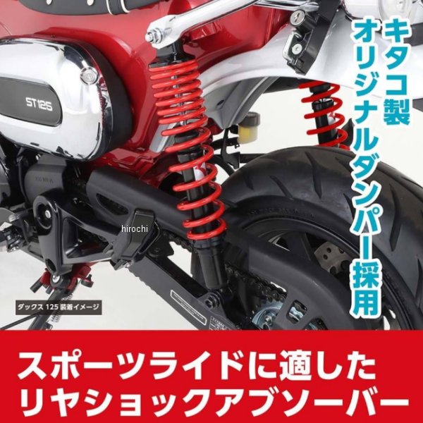 キタコ リアショック23年-25年 ホンダ ダックス125カラー:レッド1本販売自由長:343mm(ノーマル同等)オイルダンパー式プリロード調整:無段階二人乗り対応キタコオリジナルのリヤショックアブソーバーです。培ってきたミニバイクのノウハウを最大限に引き出して開発されたチューニングパーツです。