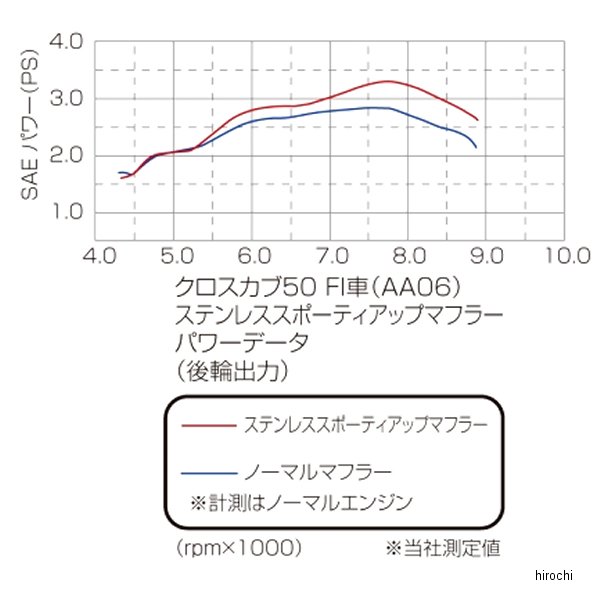 ステンレススポーティーアップマフラー18年-22年 ホンダ クロスカブ近接排気音:81db加速騒音:72dbステンレス製/バフ仕上げエキゾーストパイプヒートガード付属ノーマルサイレンサーヒートガード装着可キャタライザー内蔵重量:2.5kg(ノーマル3.4kg)スポーティーなアップタイプデザインを採用したストリートマフラー。中速から高速にかけてパワーアップし、