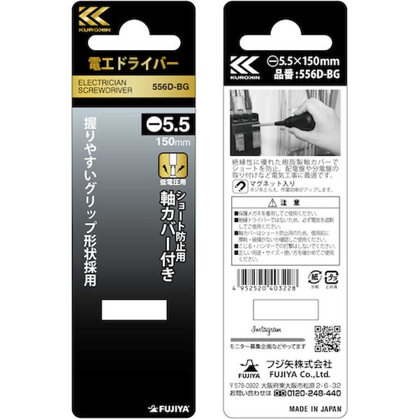 ・絶縁性に優れた樹脂製軸カバーでショートを防止できます。・握りやすいグリップ形状採用しました。・マグネットがネジをとらえ、作業効率がアップします。・グリップ上部で+-を見分けることができます。・絶縁性に優れた樹脂製軸カバーでショートを防止。・配電盤や分電盤の取り付けなど電気工事に最適です。・刃先:[[-]]5.5・軸長(mm):150・全長(mm):236・Si-Cr-V鋼・保護メガネを着用してご使用ください。・絶縁ドライバーではないため、必ず電気を遮断してご使用ください。・軸カバーはショート防止用のため、使用前に摩耗・破損がないか確認しご使用ください。・こじる・ハンマーでの打撃はしないでください。・正しい用途・サイズ・使い方を確かめてご使用ください。・生産国 日本・JANコード 4952520403228・質量 95g・コード:333-4925 ・品目:556DBG