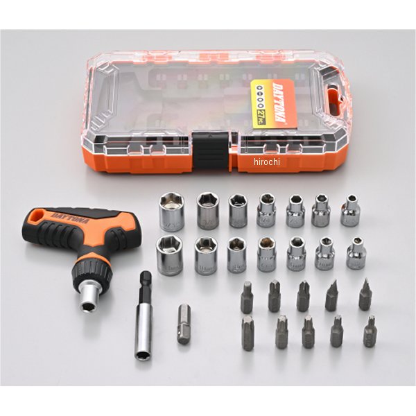 狭いスペースでも作業しやすい手のひらサイズのミニラチェットTハンドルと、六角ソケット、10種類のビットなどを組み合わせたツールセット。六角ソケットは、ミリサイズ、インチサイズ各7種類の複合セットです。全長60mmの磁気付きエクステンションバーも付属するので、奥まった場所の作業も可能です。【セット内容】・1/4インチ ミニラチェットTハンドル・1/4インチ ソケットアダプター:25mm・1/4インチ 磁気エクステンションバー:60mm・六角ソケット(ミリ):4、5、6、7、8、10、12mm・六角ソケット(インチ):5/32、3/16、7/32、1/4、5/16、3/8、15/32インチ・(+)ビット:PH2、PH3・(?)ビット:4、5mm・ヘクサロビュラ穴用(トルクス?)ビット:T15、T20、T25、T30、T40・六角ビット:4mm