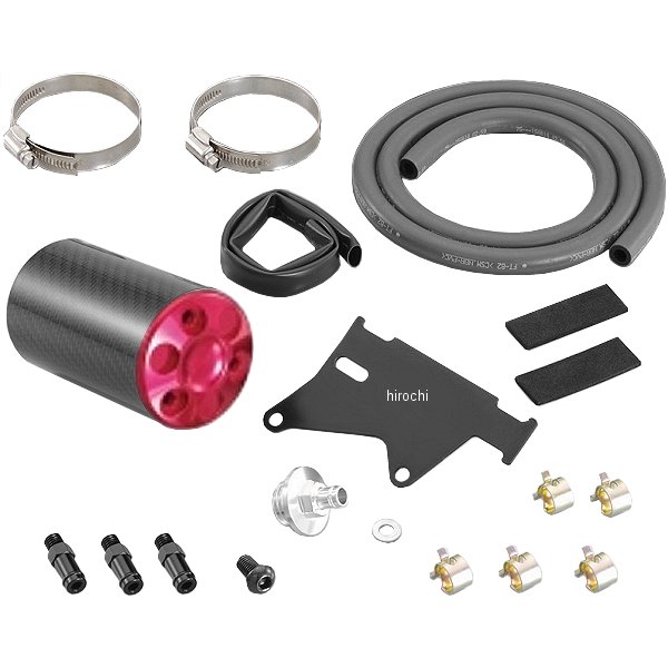 キタコ カーボンオイルキャッチタンク13年-15年 ホンダ グロム16年 ホンダ グロムMSX125SF19年-21年 ホンダ モンキー125キャッチタンクボトル:アルミ製カーボン巻カラー:赤ボトルキャップ:アルミ削り出し/アルマイト仕上げタンクボトルサイズ:φ63x115mm容量:220mlタンクステー:スチール製ブラックピストン運動の妨げとなるケース内部の圧力をケースブリーザーから取り出し、パワーロスとクランクケース内の温度上昇を低減します。同時に吹き出るオイルをキャッチタンクが確実に受け止め圧力のみを大気放出させます。