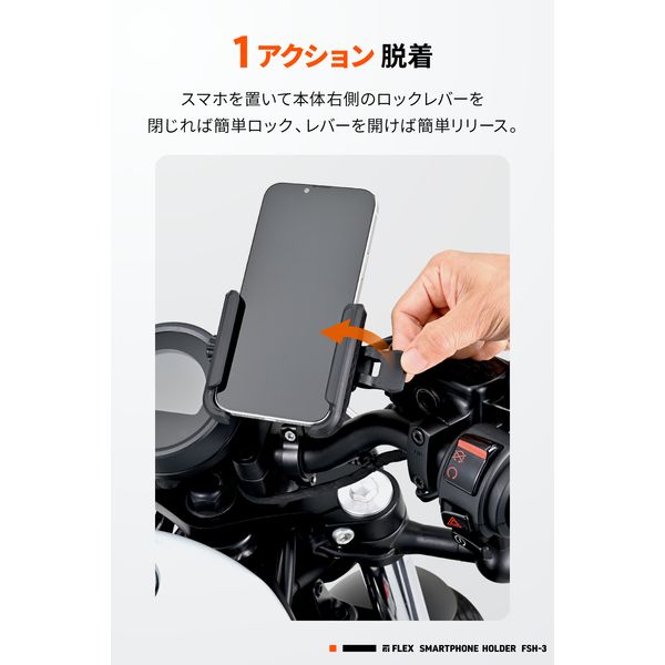 デイトナ バイク用 iPhone16 ProMax スマホホルダー 振動吸収 3D角度調整 ワンアクション 小型 フレックス FSH-3 ブラック左右のアームでガッチリ固定、ワンアクアションで脱着できるバイク用スマートフォンホルダー。【ワンアクションでカンタン脱着】取り付けには、スマホを置いて本体の右側のロックレバーを閉じるだけの簡単ロック。レバーを開けば簡単リリース。【振動吸収ダンパー】スマホを支える本体背部に4つのダンパーを装備。ハンドルから伝わる振動を吸収しカメラを保護します。【3D角度調整&高耐久ボール】2つのボールジョイント機構により、あらゆる角度や位置に調整可能。ボールは金属・ナイロン・シリコンの3層構造で、劣化しにくくズレにくい。【左右アームでガッチリ固定】左右の高強度アームでスマートフォンを確実に固定。【スマホカメラを保護】スマホカメラを回避する形状で、カメラへのキズを防止。【工具不要でカンタン調整】スマホ装着時に工具不要。本体左側のダイヤルを回すだけでサイズ調整可能。・対応スマーフォンサイズ:縦4.5-7インチ、幅66-99×厚み13(mm)以下、重量250gまで