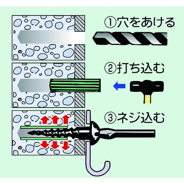 ・木ねじがコンクリート、ブロックの壁面に使えます。・割れません。・抜けません。・腐りません。・コンクリート、ブロックの壁面に。・呼び径(mm):6・長さ(mm):25・穿孔深さ(mm):28・引張最大荷重(kN)コンクリート:3.14・引張最大荷重(kN)ALC:0.51・下穴径(mm):6・下穴径(mm)コンクリート:6・下穴径(mm)ALC:6・使用ビス径(mm):3.5 3.8 4.1・色:イエロー・適合ねじ:木ねじ、タッピングねじ・ナイロン・簡易ポンチ・ポンチなどで必ず3mm奥へ打ち込んでください。・穴の中の切粉は取り除いてください。・生産国 日本・JANコード 4992456030037・質量 210g・コード:115-1083 ・品目:625