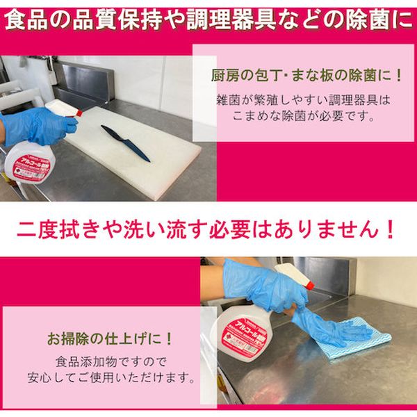 ・食品の品質保持や機器類の除菌に適しています。・中性なので安心してお使いいただけます。・調理器具類の除菌。・容量(ml):500・容量(L):0.5・希釈倍率(倍):原液・原液使用・火気厳禁・エタノール(67.1w/w%)、グリセリン脂肪酸エステル(0.3w/w%)、グリセリン(0.2w/w%)、乳酸ナトリウム(0.0065w/w%)、水(31.7w/w%)・生産国 日本・JANコード 4987696400658・質量 0.400kg・コード:650-9937 ・品目:40065