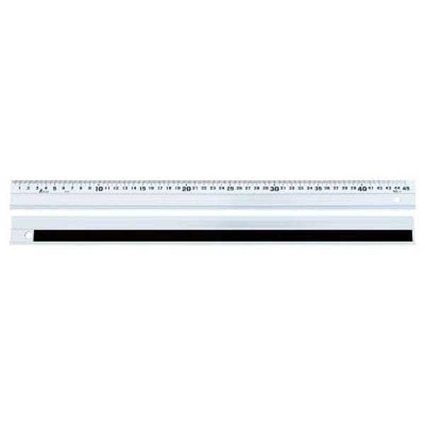 ・大きな目盛数字表示を採用しました。・軽くてさびず丈夫です。・カッティング面より高い危険防止壁付で、カッターの刃が滑っても乗り越えにくい形状になっています。・長さの測定・カッティング定規・溝引きとして。・全長(mm):460・幅(mm):35・厚さ(mm):5・呼び寸法(mm):450・目盛精度(mm):±0.25・真直度(mm):ー・色:シルバー・目盛:cm表示・長さの許容差:±0.25mm・本体:アルミ・滑り止め:スポンジ・アルミは温度の変化で伸縮しやすい為、精度の要する測定に使用できません。・生産国 中国・JANコード 4960910653580・質量 79g・コード:408-3580 ・品目:65358